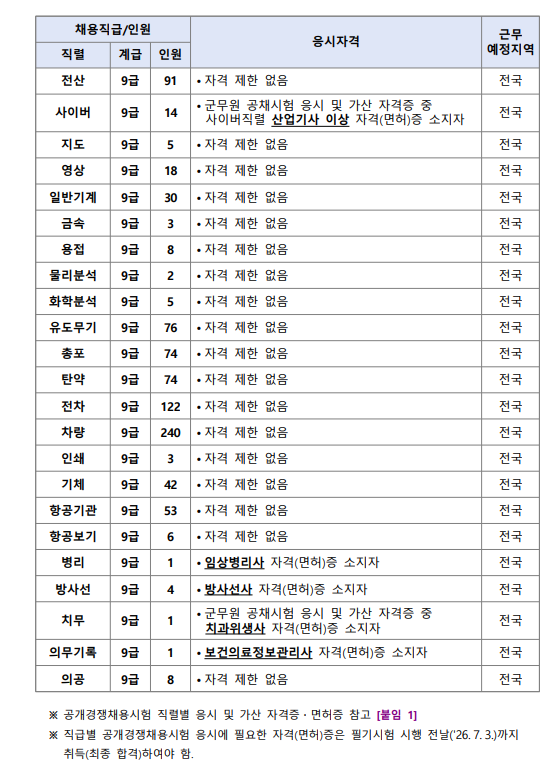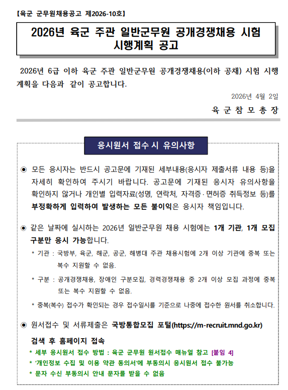 2026년도 육군 주관 일반군무원 공개경쟁채용 시험 시행계획 공고