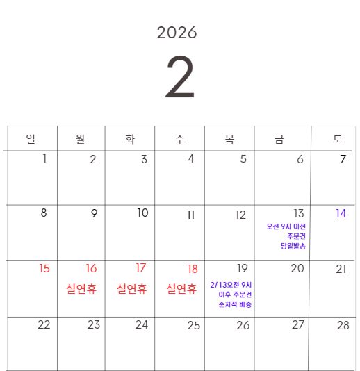 - 2/14(토)~2/18(금) 설 연휴 기간 동안