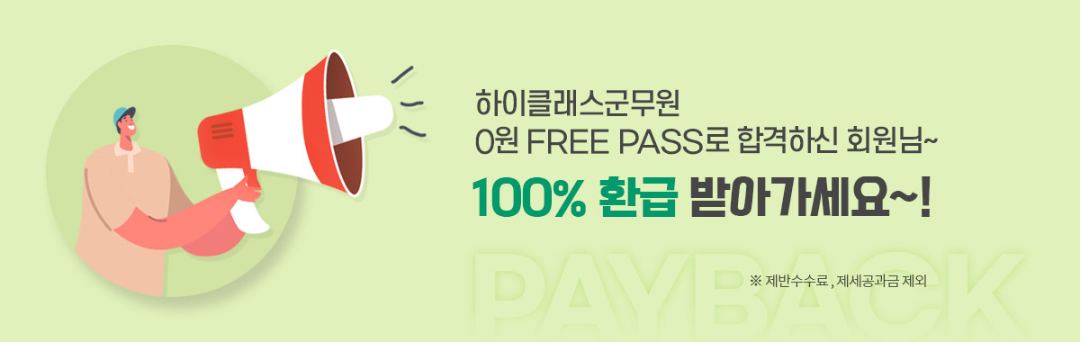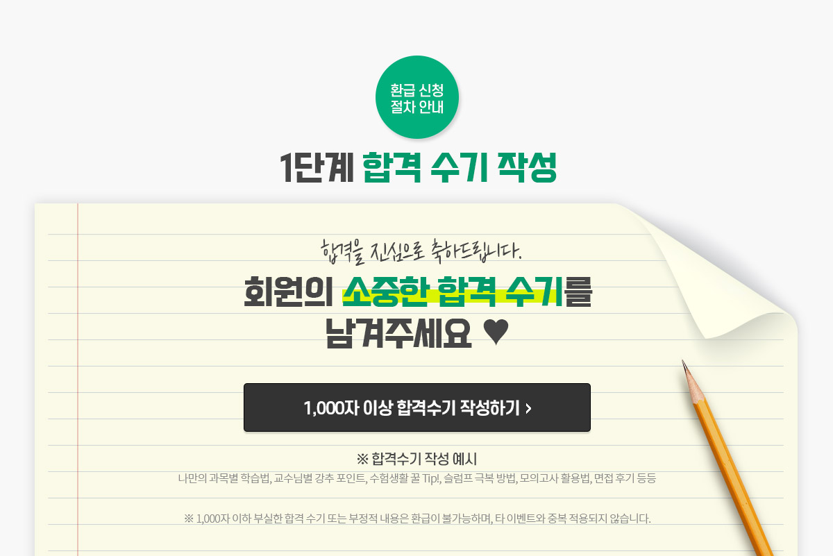 · 환급은 수강하신 해당 직렬에 합격하신 경우 지급합니다.(예:행정 수강-행정 합격 시 지급, 경채 합격 시 미 지급)