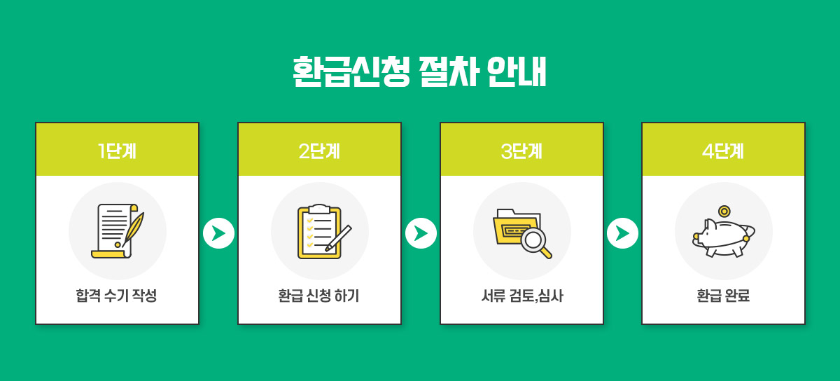 · 수강종료 후 최종 합격 시 환급 신청은 당해 년도 1회에 한해서만 환급 가능 합니다. (해당 년도가 지나면 환급되지 않습니다.)