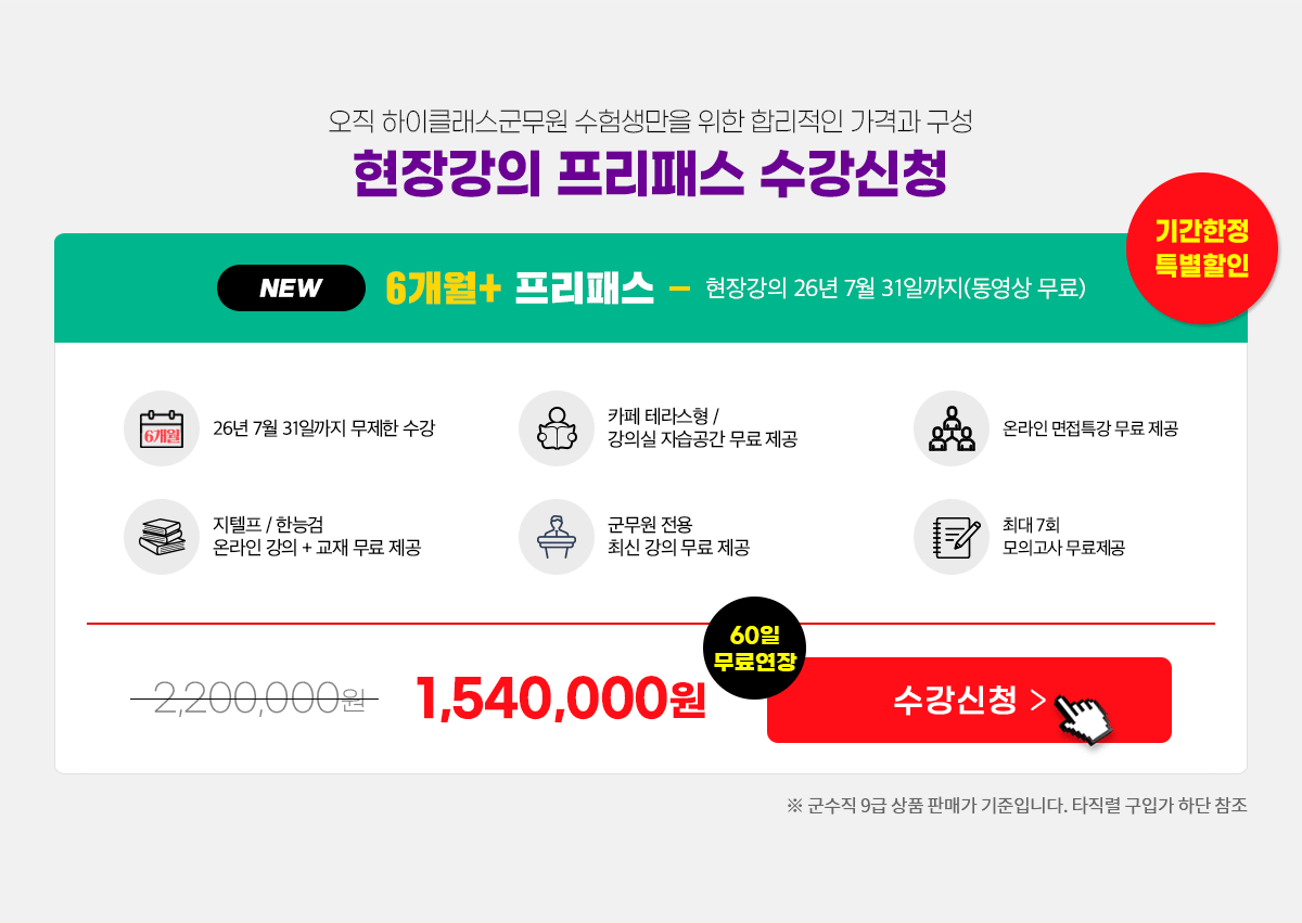·평생 무료 강의 연장을 위해서는 해당년도 군무원 시험에 응시하신 수험표가 필요하며 신청 기간 내 접수하지 않으면 혜택은 종료 됩니다.