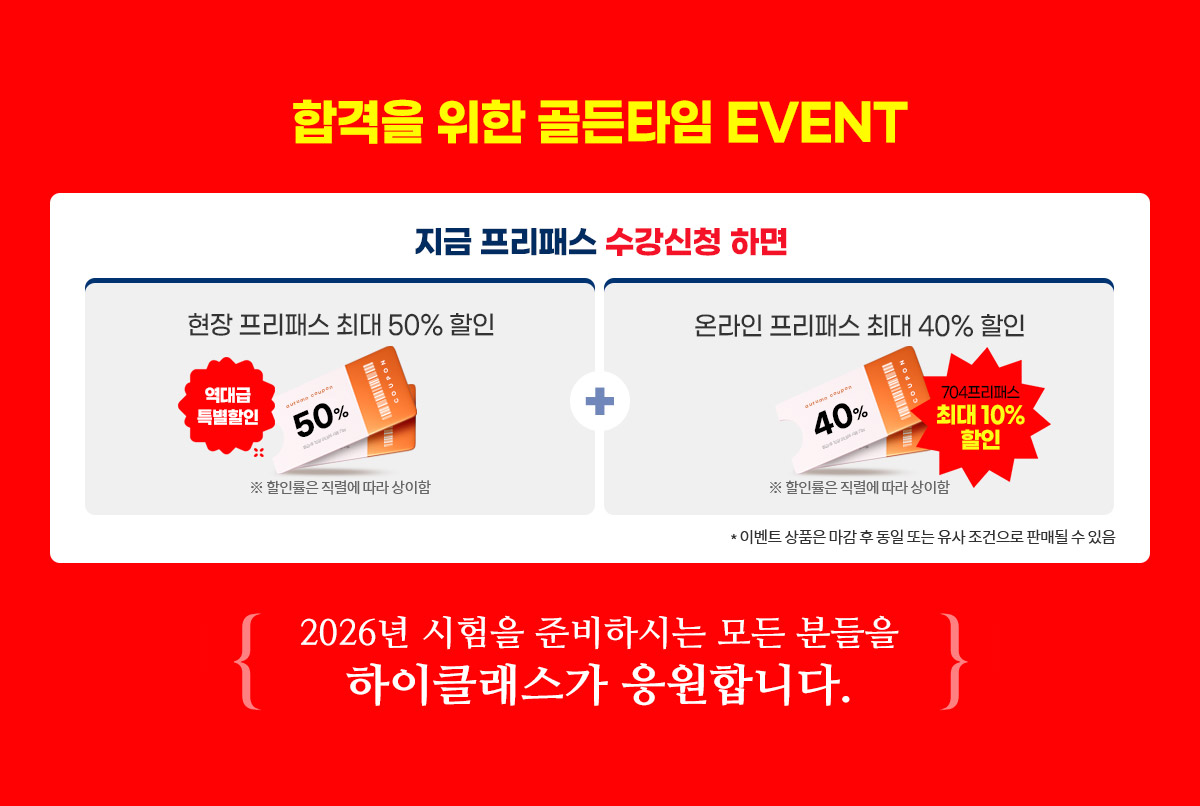 ·평생 무료강의 연장은 평생프리패스, (구)Unlimited 구매자가 불합격 시 1년씩 추가 제공되며 환불 시에는 제공하지 않습니다.