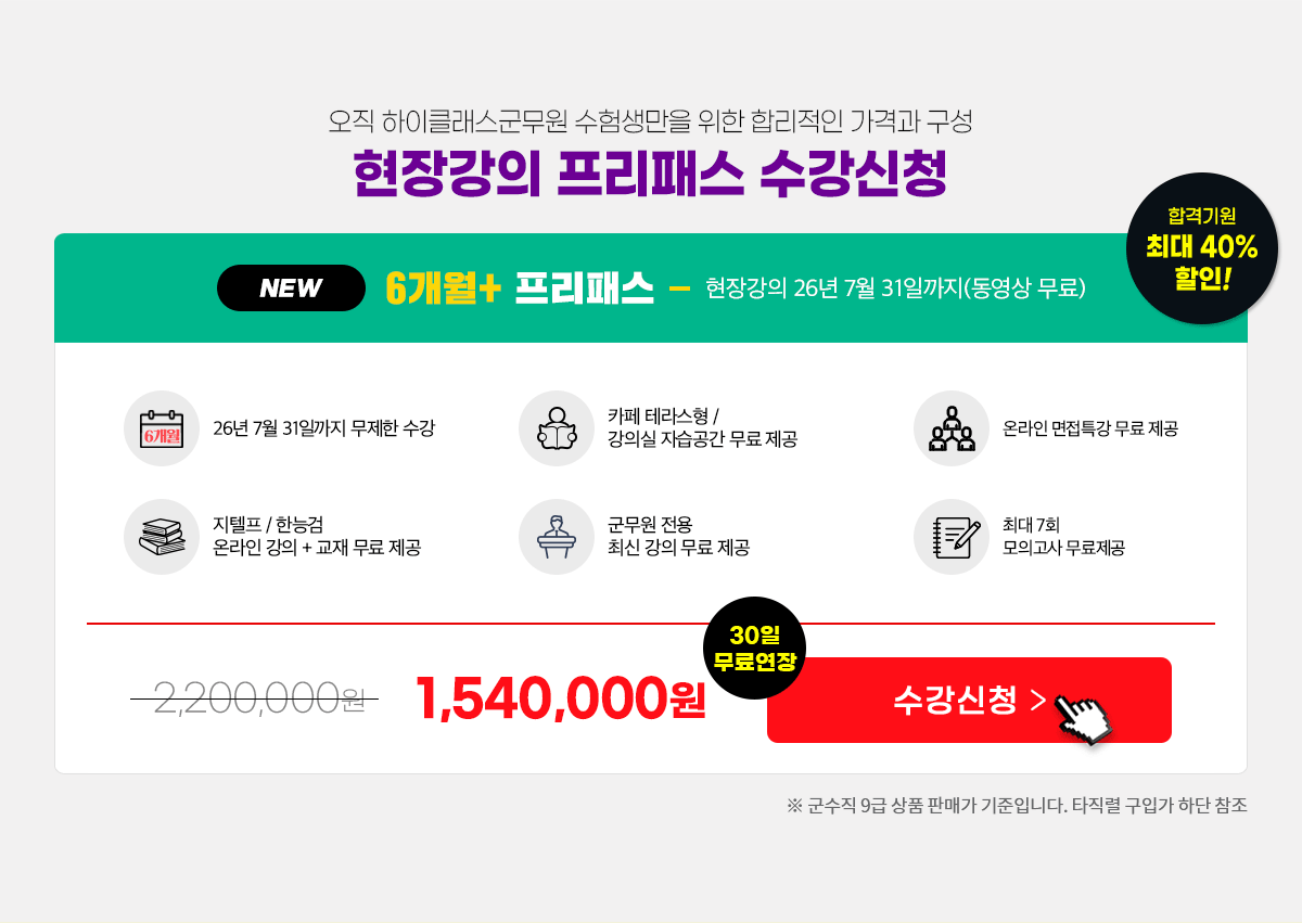 ·평생 무료 강의 연장을 위해서는 해당년도 군무원 시험에 응시하신 수험표가 필요하며 신청 기간 내 접수하지 않으면 혜택은 종료 됩니다.