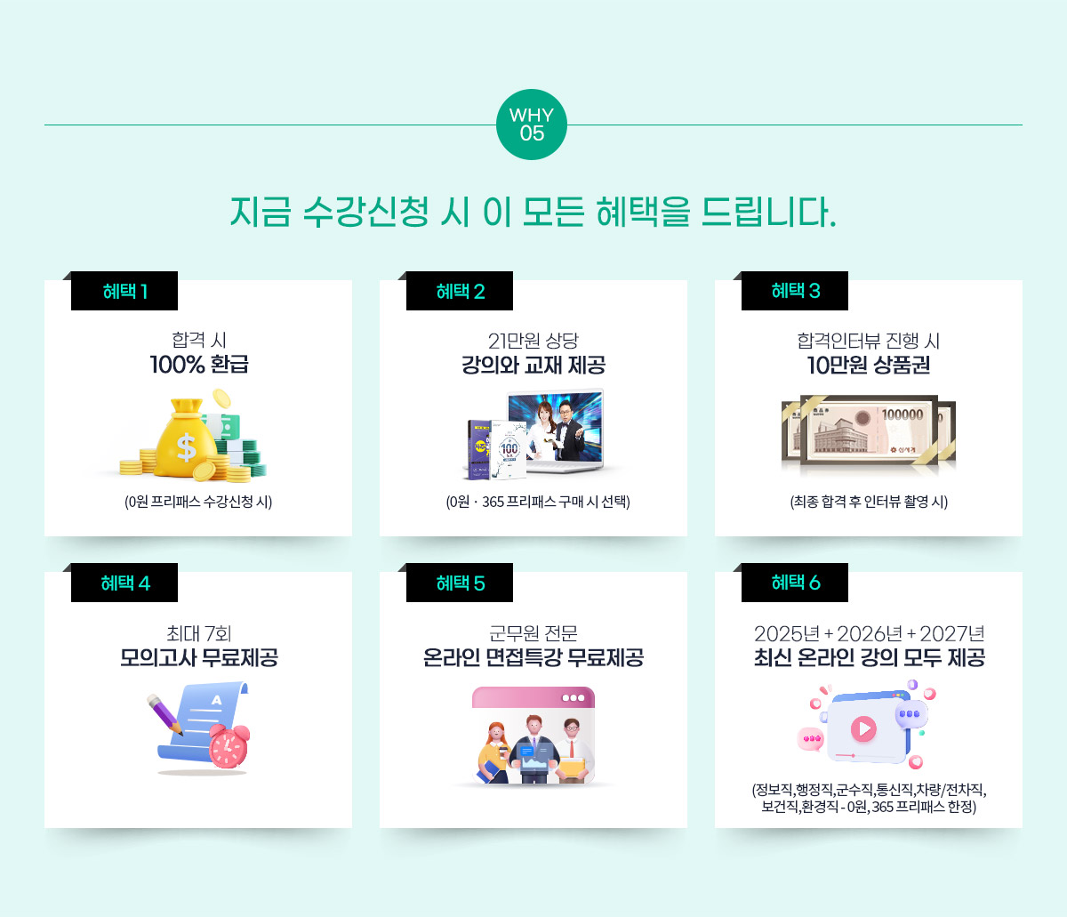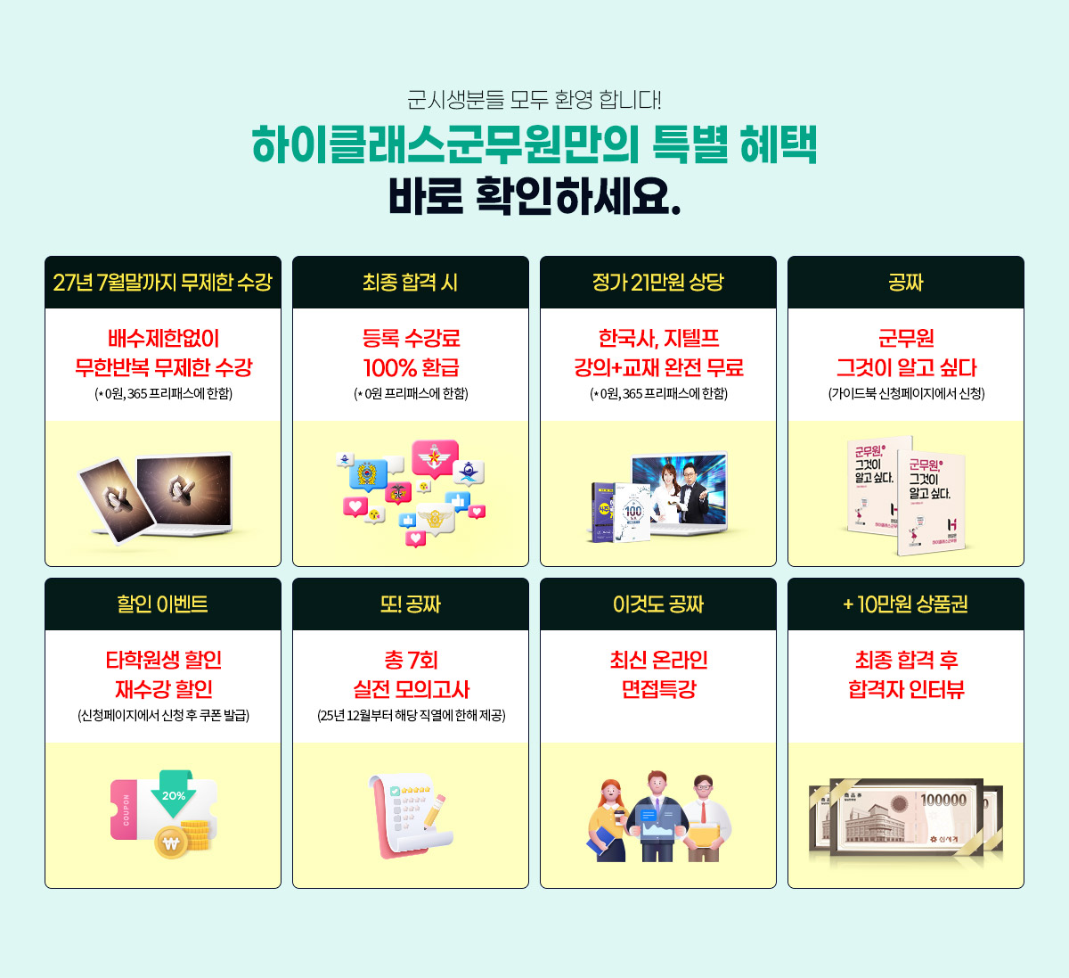 ·평생 무료 강의 연장을 위해서는 군무원 시험에 응시한 수험표가 필요하며 신청 기간 내 접수하지 않으면 혜택은 종료 됩니다.