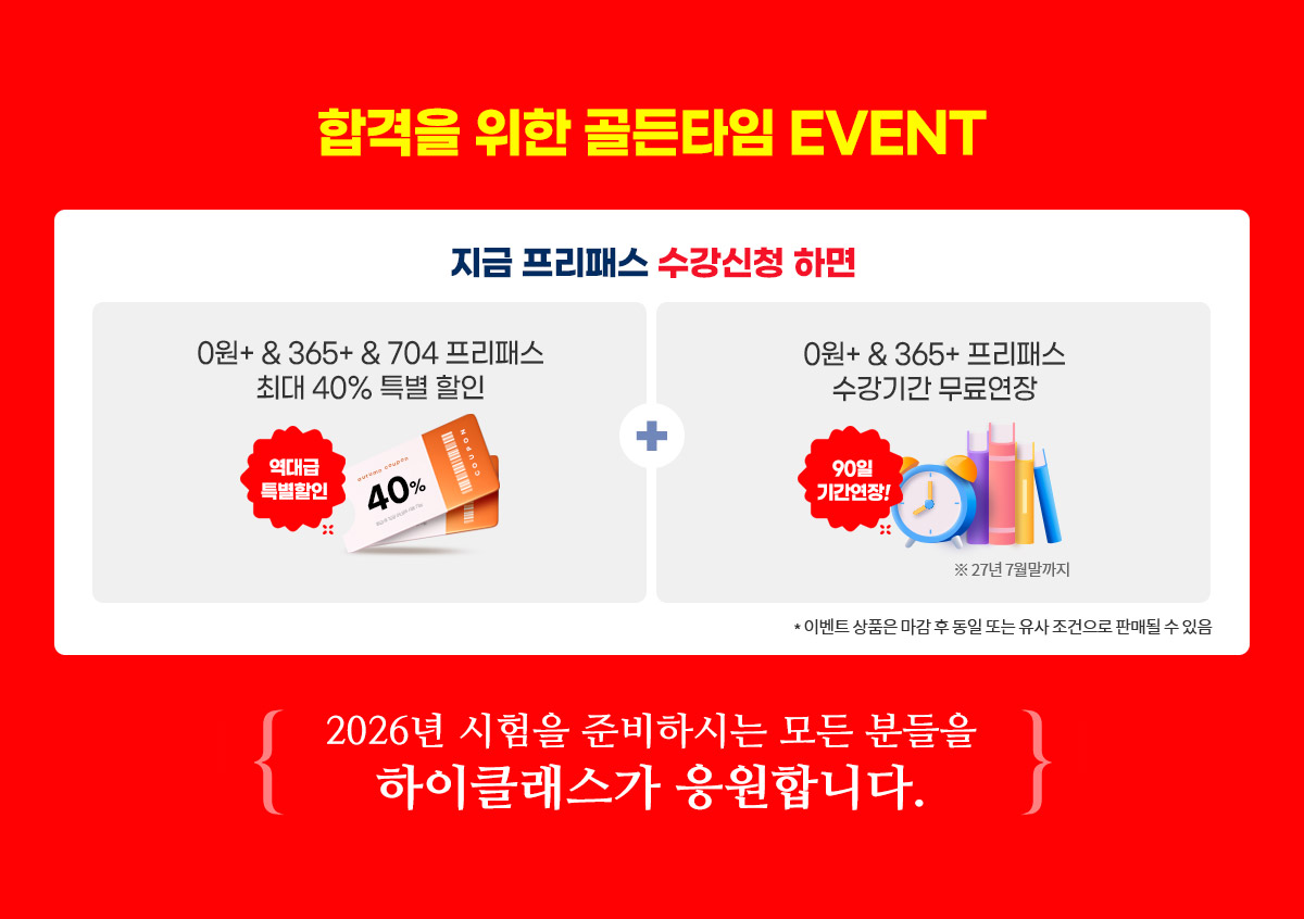 ·평생 무료강의 연장은 평생프리패스, (구)Unlimited 구매자가 불합격 시 1년씩 추가 제공되며 환불 시에는 제공하지 않습니다.